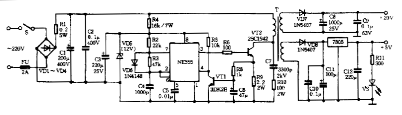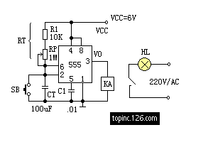| 选择分类:当前分类——常用资料 相关联或者相类似的文章: 推荐一款小巧玲珑的PDF阅读软件(533) 9. 一键多功能按键识别技术(533) 27. ADC0809A/D转换器基本应用技术(533) 超短波物品遗留提醒报警器(533) 致各职业学校、电子初学者、电子爱好者(533) 一个男人的自白:找情人已经是件很老土的事了(532) protel 使用的60个问题和解答(532) “残局”骗术要当心 (532) 再度出击,20元打造经典PC遥控器!(531) SQL转ACCESS解决自动编号问题(531) LED显示应用:生产电子看板系统(530) 穷人为什么穷(530) 如何选择入门的教材(529) 经济实用的发射功率测试笔 (529) 用CD4046作镍镉电池快速充电器(529) 1.红外遥控噐软件解码及其应用(529) 电子元器件使用须知(四)(528) [转帖]网恋是怎样炼成的(528) 如何理解电容的高频和低频特性(528) PT2262/2272编解码集成电路介绍(528) 首页 前页 后页 尾页 本站推荐: | 555时基电路原理以及应用 555内部电原理图 ![]() 我们知道,555电路在应用和工作方式上一般可归纳为3类。每类工作方式又有很多个不同的电路。 在实际应用中,除了单一品种的电路外,还可组合出很多不同电路,如:多个单稳、多个双稳、单稳和无稳,双稳和无稳的组合等。这样一来,电路变的更加复杂。为了便于我们分析和识别电路,更好的理解555电路,这里我们这里按555电路的结构特点进行分类和归纳,把555电路分为3大类、8种、共18个单元电路。每个电路除画出它的标准图型,指出他们的结构特点或识别方法外,还给出了计算公式和他们的用途。方便大家识别、分析555电路。下面将分别介绍这3类电路。 单稳类电路 单稳工作方式,它可分为3种。见图示。 第1种(图1)是人工启动单稳,又因为定时电阻定时电容位置不同而分为2个不同的单元,并分别以1.1.1和1.1.2为代号。他们的输入端的形式,也就是电路的结构特点是:“RT-6.2-CT”和“CT-6.2-RT”。 ![]() 第2种(图2)是脉冲启动型单稳,也可以分为2个不同的单元。他们的输入特点都是“RT-7.6-CT”,都是从2端输入。1.2.1电路的2端不带任何元件,具有最简单的形式;1.2.2电路则带有一个RC微分电路。 ![]() 第3种(图3)是压控振荡器。单稳型压控振荡器电路有很多,都比较复杂。为简单起见,我们只把它分为2个不同单元。不带任何辅助器件的电路为1.3.1;使用晶体管、运放放大器等辅助器件的电路为1.3.2。图中列出了2个常用电路。 ![]() 双稳类电路 这里我们将对555双稳电路工作方式进行总结、归纳。555双稳电路可分成2种。 第一种(见图1)是触发电路,有双端输入(2.1.1)和单端输入(2.1.2)2个单元。单端比较器(2.1.2)可以是6端固定,2段输入;也可是2端固定,6端输入。 ![]() 第2种(见图2)是施密特触发电路,有最简单形式的(2.2.1)和输入端电阻调整偏置或在控制端(5)加控制电压VCT以改变阀值电压的(2.2.2)共2个单元电路。 ![]() 双稳电路的输入端的输入电压端一般没有定时电阻和定时电容。这是双稳工作方式的结构特点。2.2.2单元电路中的C1只起耦合作用,R1和R2起直流偏置作用。 无稳类电路 第三类是无稳工作方式。无稳电路就是多谐振荡电路,是555电路中应用最广的一类。电路的变化形式也最多。为简单起见,也把它分为三种。 第一种(见图1)是直接反馈型,振荡电阻是连在输出端VO的。 ![]() 第二种(见图2)是间接反馈型,振荡电阻是连在电源VCC上的。其中第1个单元电路(3.2.1)是应用最广的。第2个单元电路(3.2.2)是方波振荡电路。第3、4个单元电路都是占空比可调的脉冲振荡电路,功能相同而电路结构略有不同,因此分别以3.2.3a 和3.2.3b的代号。 ![]() 第三种(见图3)是压控振荡器。由于电路变化形式很复杂,为简单起见,只分成最简单的形式(3.3.1)和带辅助器件的(3.3.2)两个单元。图中举了两个应用实例。 ![]() 无稳电路的输入端一般都有两个振荡电阻和一个振荡电容。只有一个振荡电阻的可以认为是特例。例如:3.1.2单元可以认为是省略RA的结果。有时会遇上7.6.2三端并联,只有一个电阻RA的无稳电路,这时可把它看成是3.2.1单元电路省掉RB后的变形。 以上归纳了555的3类8种18个单元电路,虽然它们不可能包罗所有555应用电路,古话讲:万变不离其中,相信它对我们理解大多数555电路还是很有帮助的。 各种应用电路 555触摸定时开关 集成电路IC1是一片555定时电路,在这里接成单稳态电路。平时由于触摸片P端无感应电压,电容C1通过555第7脚放电完毕,第3脚输出为低电平,继电器KS释放,电灯不亮。 ![]() 当需要开灯时,用手触碰一下金属片P,人体感应的杂波信号电压由C2加至555的触发端,使555的输出由低变成高电平,继电器KS吸合,电灯点亮。同时,555第7脚内部截止,电源便通过R1给C1充电,这就是定时的开始。 当电容C1上电压上升至电源电压的2/3时,555第7脚道通使C1放电,使第3脚输出由高电平变回到低电平,继电器释放,电灯熄灭,定时结束。 定时长短由R1、C1决定:T1=1.1R1*C1。按图中所标数值,定时时间约为4分钟。D1可选用1N4148或1N4001。 相片曝光定时器 附图电路是用555单稳电路制成的相片曝光定时器。用人工启动式单稳电路。 工作原理: 电源接通后,定时器进入稳态。此时定时电容CT的电压为:VCT=VCC=6V。对555这个等效触发器来讲,两个输入都是高电平,即VS=0。继电器KA不吸合,常开点是打开的,曝光照明灯HL不亮。 ![]() 按一下按钮开关SB之后,定时电容CT立即放到电压为零。于是此时555电路等效触发的输入成为:R=0