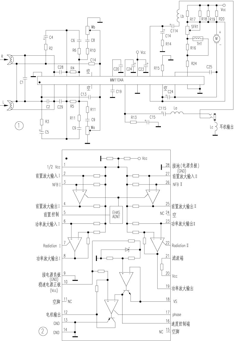 由两电路图可知,①~⑨脚、{19}~{28}脚为音频放大部分。在该音频处理电路中,前置级采用了OCL形式,而功率放大级采用了OTL形式输出。即整个音频处理电路的电源正极由{20}脚输入({21}脚为电源滤波端),⑨、{28}脚分别为功率放大级前置放大级的负极端,而①脚为中点电压1/2VCC(模拟地)。
