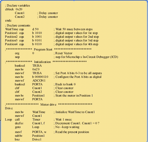 列表1给出了控制程序的汇编源代码,该程序每50毫秒旋转电机一次。首先,程序会将微控制器的数字输出初始化为表4中第一步的值,然后每隔50毫秒(此时间常数由程序中的常量waitTime定义)按照正确的顺序循环输出数字信号。若需使电机反向旋转,只需按与表4所示相反的顺序输出数字信号即可。