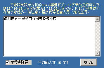 本软件可以自行修各单元点并立即生成代码,也可以输入文字自动生成代码,也可以打开图片自动生成代码!还可以通过串口自动发送代码。点击软件中的 就可以将文字或者图片自动生成代码,生成代码后,再点击右下角的就可以将代码通过选定的串口以9600波特率向产品发送!